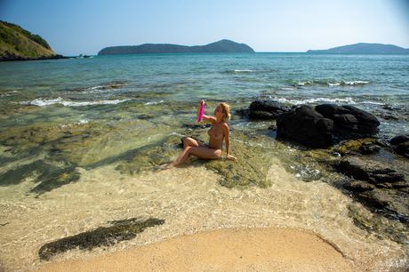 Stunning 18: Sexet russisk Belle Delilah G udgør nøgen på et stenet udstråling ved søen