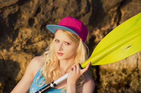 Met Art: Skinny Blonde Nika N bliver nøgen på en kano og viser hendes tatoveringer og fisse