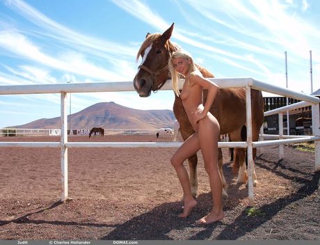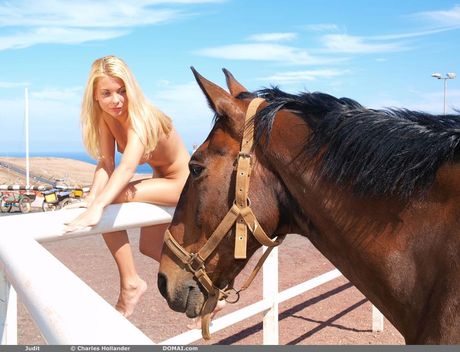 Domai: Blonde Teen Judit posiert nackt auf einer Ranch mit einem Pferd im Hintergrund
