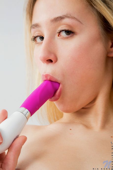 Nubiles: Blonde Teen Ria Koks finger ihre Muschi, nachdem sie nackt auf einem Bett geworden ist