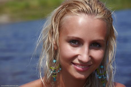 Errotica Archives: Nackte blonde Küken Afina, die ihre nasse Muschi und schöne Titten am Strand zur Schau stellen