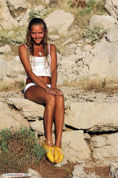 Goddess Nudes: Petite Teen Katya Clover wird nackt auf einer Decke im Garten