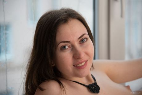 Erotic Beauty: Tender Teen Angela H entfernt schwarze Dessous zu modellieren nackt auf einer Fensterbrille