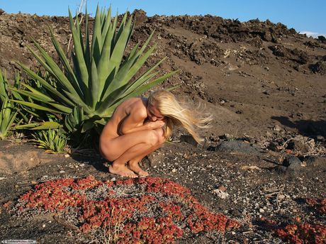 Goddess Nudes: Junge blonde Justizmodelle, die mit Anmut völlig nackt auf einer Terrasse