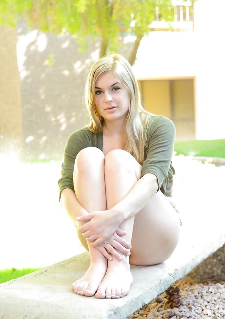 Danielle FTV: Fascinante hottie rubia Danielle Delaunay en falda revelando grandes aldabas y coño peludo al aire libre
