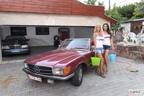 Porn World: Lesbianas calientes Zafira y Peneloppe Ferre Lave un auto y follar en la arena