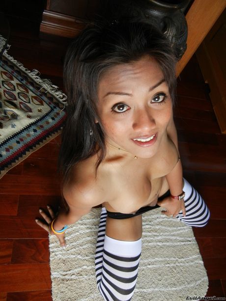 Evil Angel: Sexy Asian Shemale Nong muestra sus grandes tetas y juguete su polla en medias