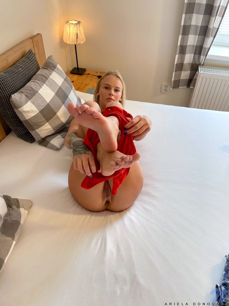 Nubiles: La rubia sexy Ariela Donovan desnuda y frota su coño rosa en una cama