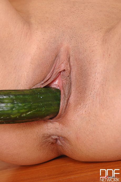 Porn World: Sexy morena Coco de Mal se masturba con un calabacín en la cocina