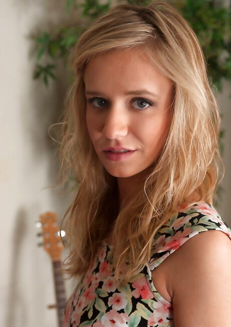 Nubiles: Impresionante joven estadounidense rubia Rachel James en ropa interior exponiendo tetas pequeñas y extendiendo sus piernas