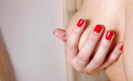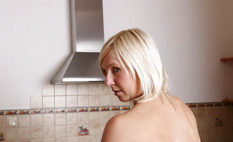 Karups Older Women: Excelente rubia EMILIA EMILIA exhibiendo grandes tetas y coño afeitado en la cocina