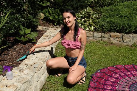 ALS Scan: Teen Amateur Sasha Sparrow se desnuda en un patio antes de tocar su coño