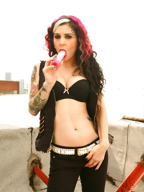Joanna Angel: Milf estadounidense muy atractivo Joanna Angel exponiendo grandes tetas y rellenando su arranque con un juguete al aire libre