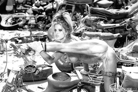 Penthouse Gold: Blonde Centerfold Janine Lindemulder démontre ses gros faux seins à l'extérieur