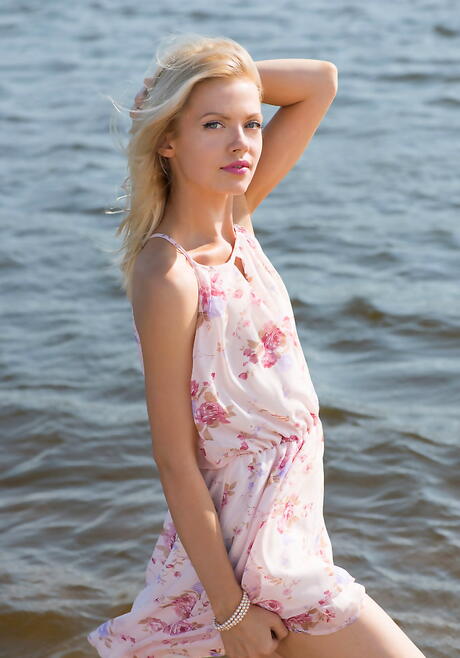 Met Art: Camelia adolescente blonde chevronnée révélant de petits seins et une chatte rasée à la plage