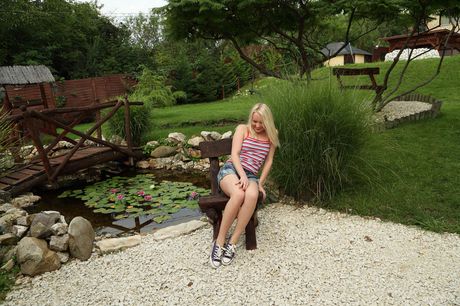 ALS Scan: Skinny Blonde Gina Gerson se déshabille et taquine avec ses minuscules seins à l'extérieur