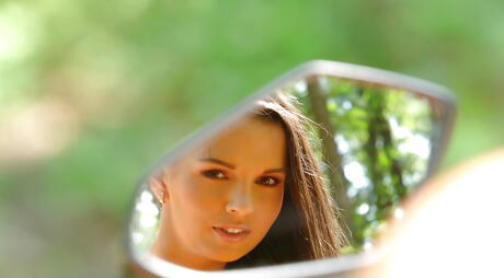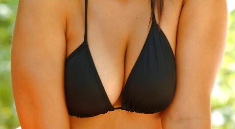 Adorable american dark hair milf Eve Angel exhibiting big boobs and sexy ass outside