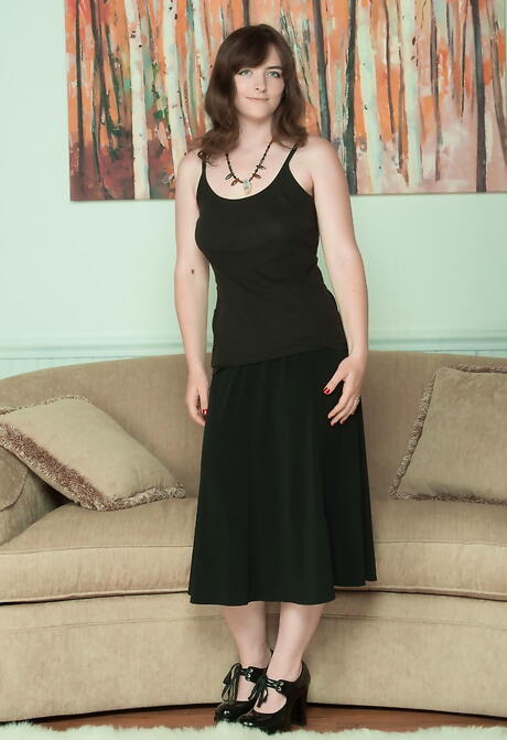 Adorable dark-haired cutie Snow shows big boobies and hairy pussy