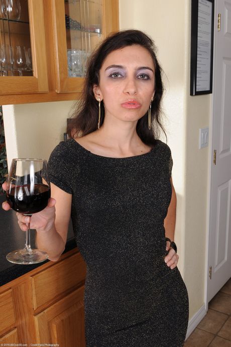 30 plus female Bella G bares her body in high heels on a kitchen counter