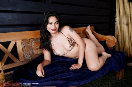 30 plus woman Lucy Sunflower removes a bikini before fingering her pussy