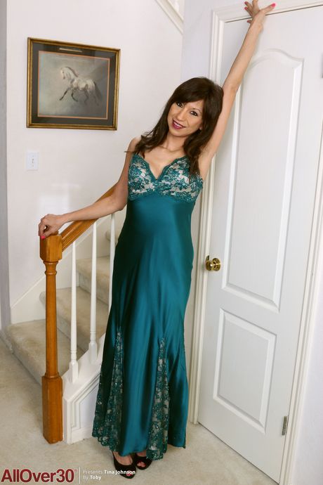 Asian MILF Tina Johnson shows her saggy tits and poses in stockings