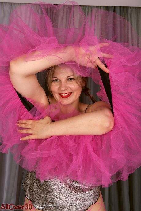 Chubby MILF Ellariya Rose toys her shaved pussy with a dildo in a solo