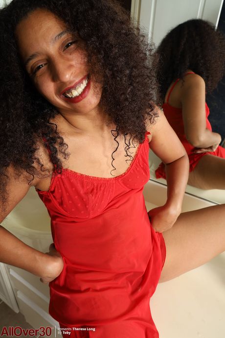 Curly-haired MILF Theresa Long shows her hairy pussy in the bathroom