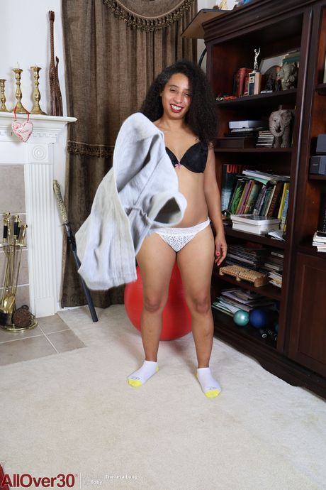 Ebony MILF Theresa Long shows her hairy underarms and trimmed bush