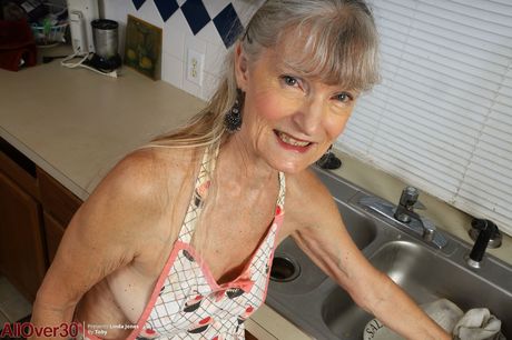 Granny Linda Jones strips and shows her wrinkly body while cleaning kitchen