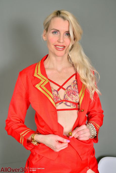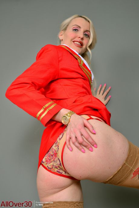 Hot blonde Lexi Lou strips to her stockings and shows her pussy