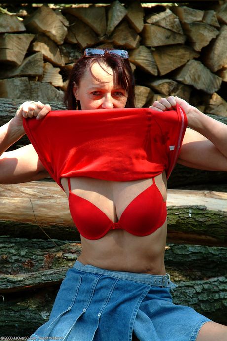 Mature blonde Helga shows off her hairy pussy and big booty outdoors