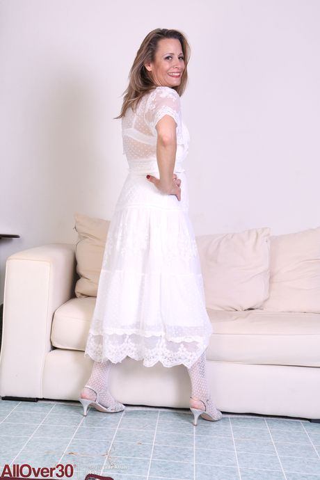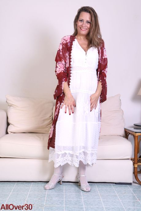 Mature blonde Jade Allan shows her big booty and poses in stockings