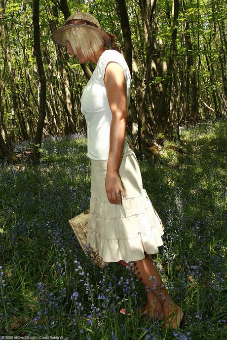 Mature blonde Jan Burton shows her big boobs and hot booty outdoors