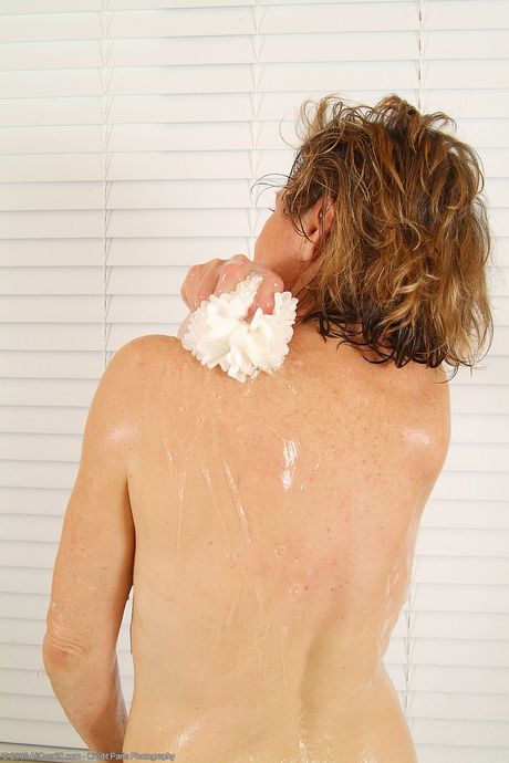 Mature blonde Judy shows off her big booty and her hairy muff in a bath
