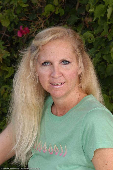 Mature blonde Kathleen shows her tiny tits and spreads her bush outdoors