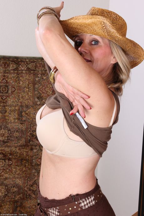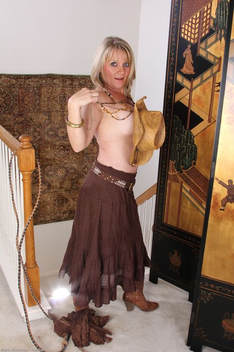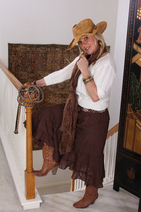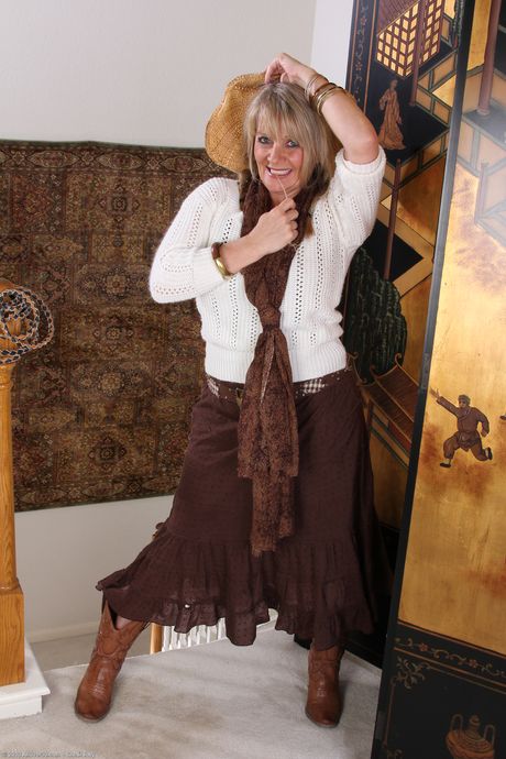 Mature blonde Sherri Donovan parts her pussy in cowgirl boots