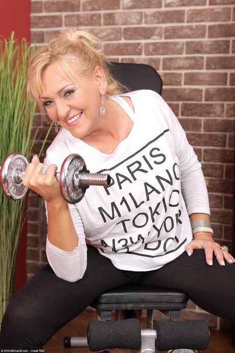 Mature blonde Sissy strips and fingers her pussy after a workout