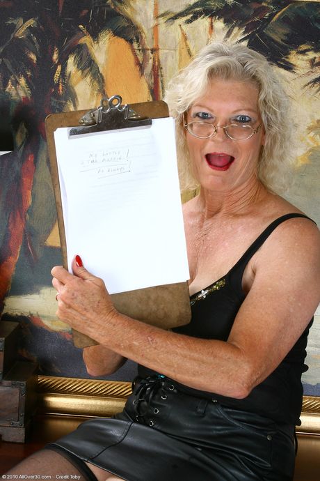 Mature granny Michelle V shows her saggy tits and shaved pussy