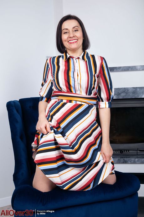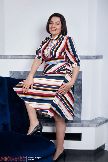 Mature housewife Allegra shows her big tits and spreads her hairy muff
