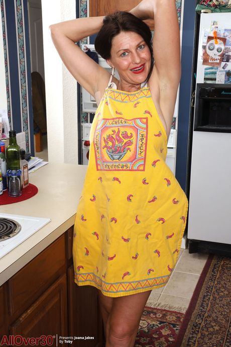 Mature housewife Joana Jakes strips in the kitchen and shows her holes