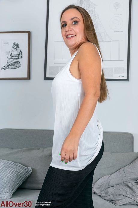 Mature lady Beatric toys her pussy with a dildo after getting naked