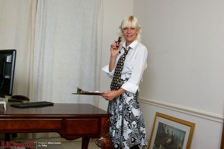 Mature lady Mimi Smith removes her glasses and lingerie to masturbate