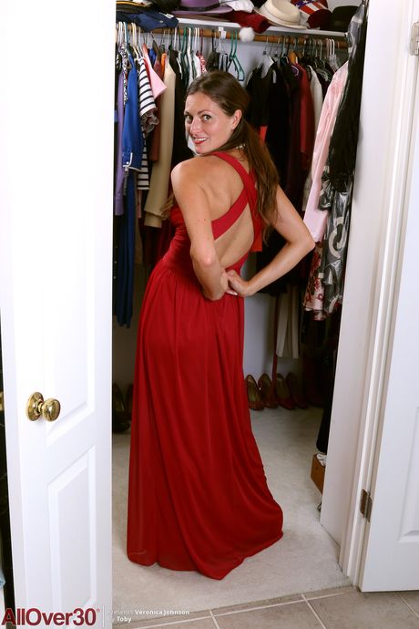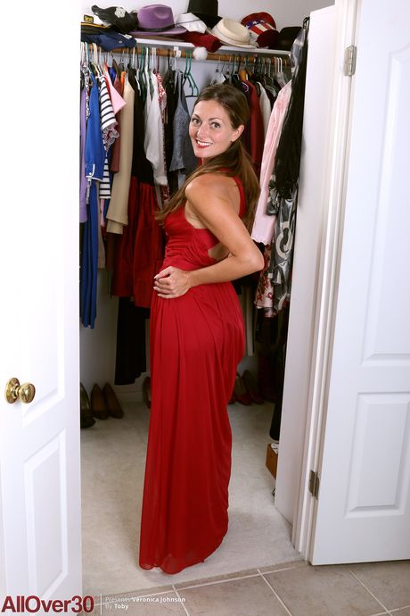 Mature lady Veronica Johnson shows her bush after undressing in closet