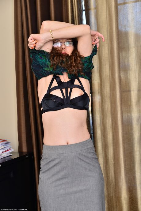 Mature secretary Janice Eros strips and spreads her pussy at her desk