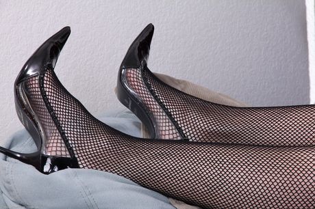 Mature woman Gail takes off her tights and heels before sucking her toes