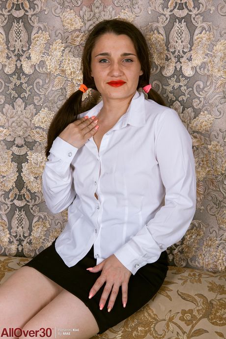 Mature woman Kivi shows her hairy pussy after getting naked in heels