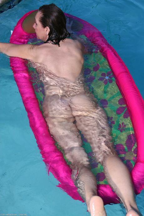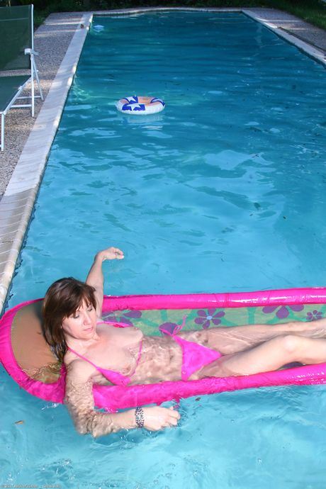 Mature woman Lynn strips and masturbates on a floaty in the pool