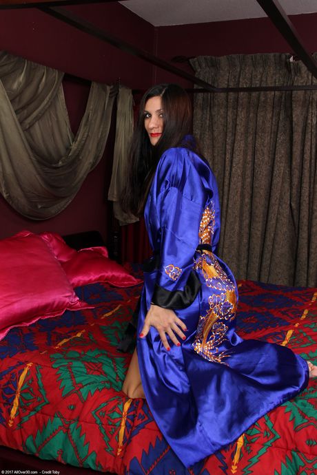 Mature woman Miranda Thompson toys her shaved vagina with a dildo