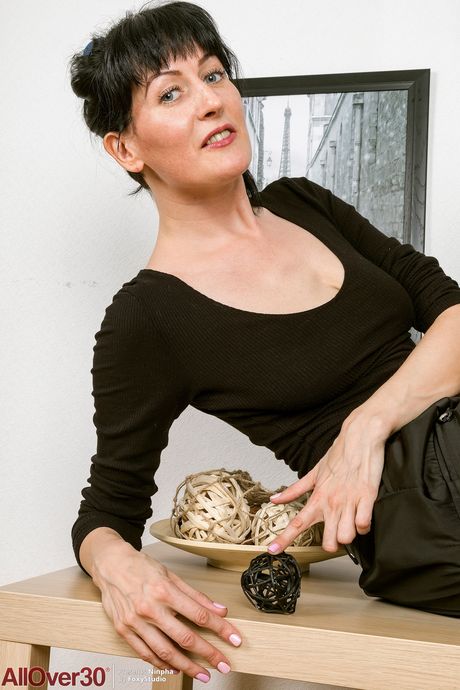 Mature woman Ninpha removes a black bodysuit to show her bush