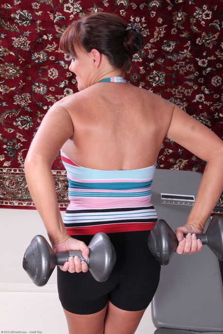 Mature woman Shauna shows her trimmed muff after doffing spandex shorts